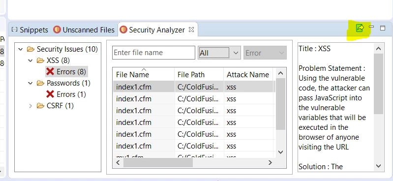 It is exported as HTML file. You can run the scan, once the report is available. In Builder Security Analyzer windows, you can see an Export Icon. Click on it, select the folder and save it. Adding a screenshot for your reference.