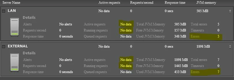 What are Running Requests and why no details? What are the Errors? What do the Errors relate to eg CFadminUI > Debugging & Logging > Log Files, CF\runtime\logs\OUT or EVENT log?