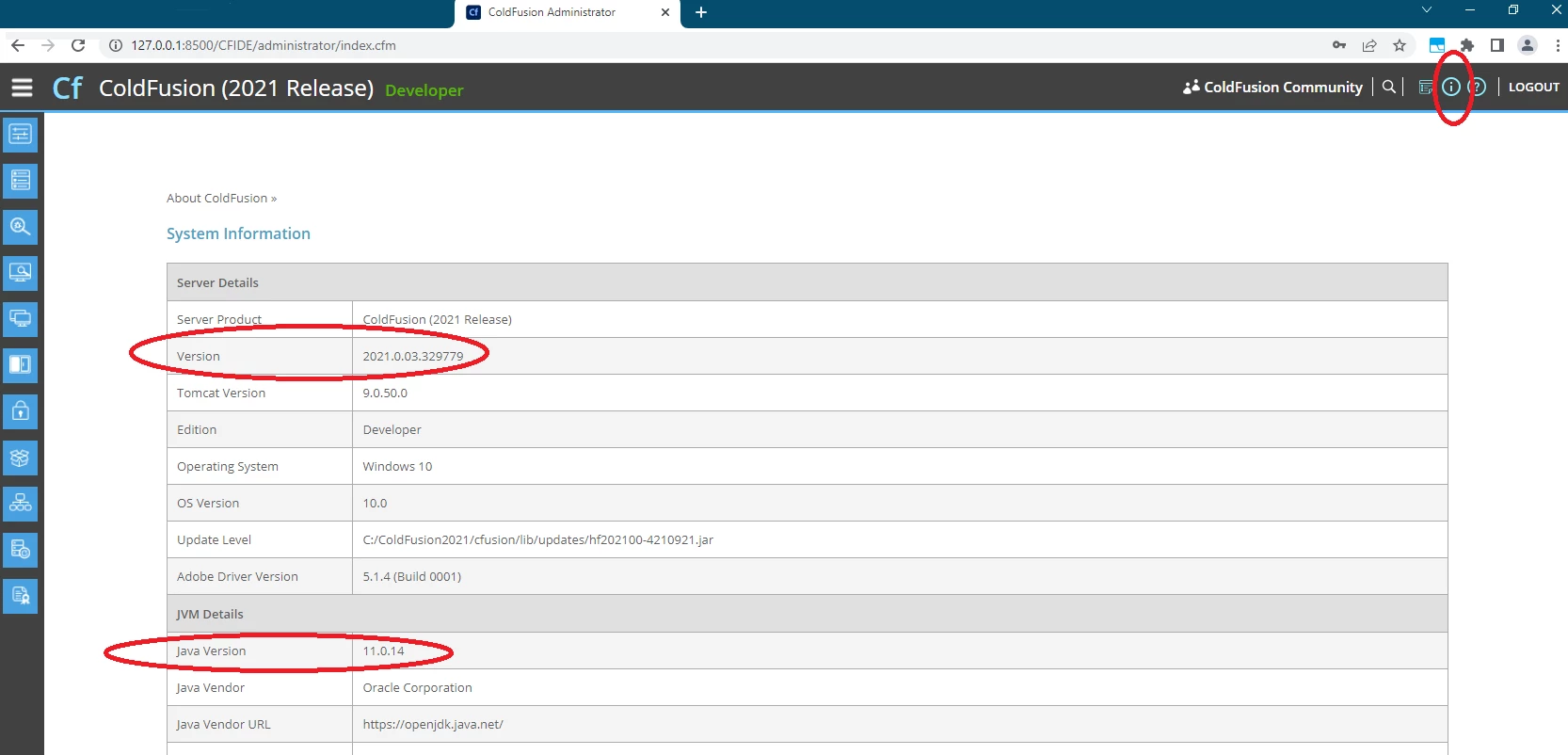 Open the ColdFusion Administrator. Click on the (i) in the top right-hand corner. You should then see the System Information page.