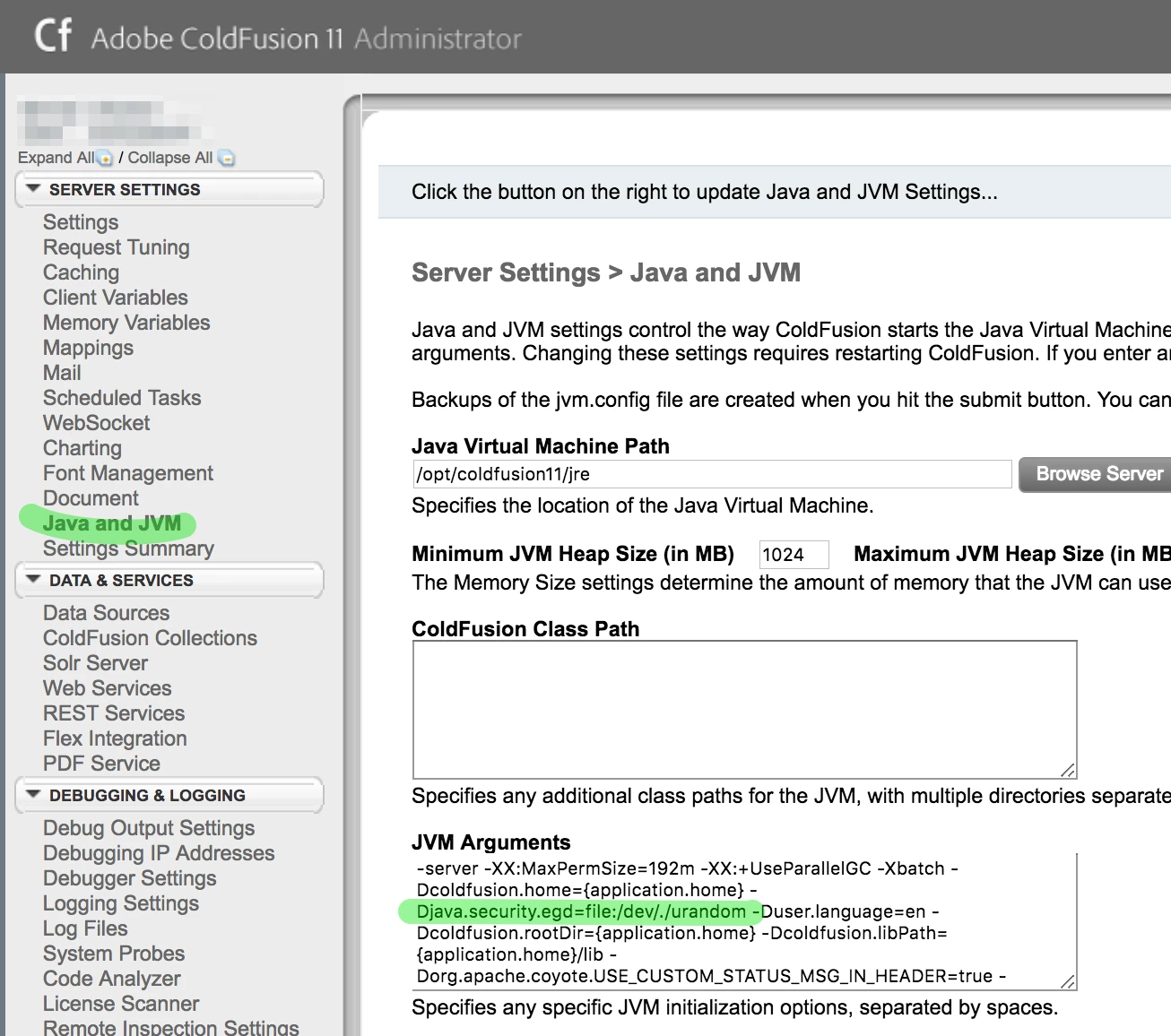 For clarification we simply change the highlighted arg from securerandom.source=file:/dev/random