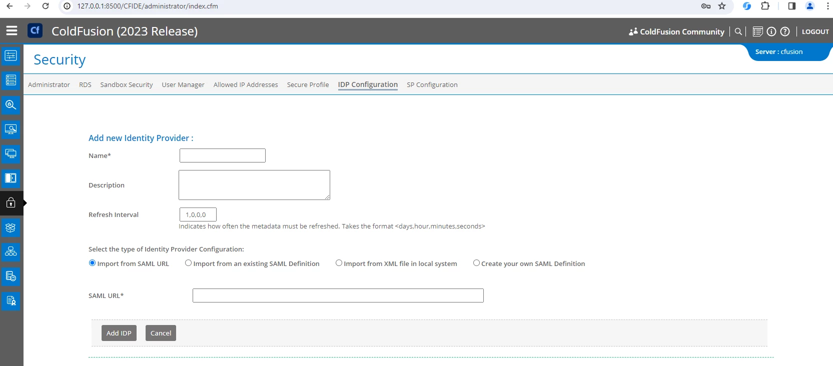 I uploaded the .xml for creation of the IDP Configuration. For IDP Xml upload, there is no spot for uploading a cert file