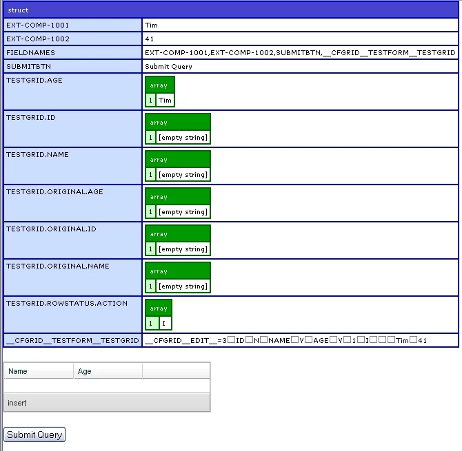 Upon making an edit to a row, submitting the form and doing a cfdump of the form, something very odd is apparent: