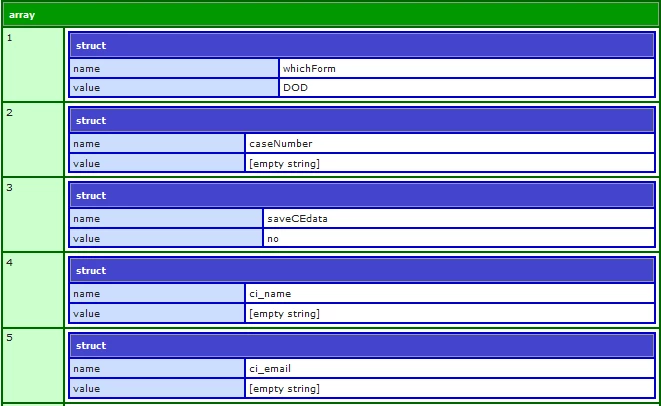 I've got a form that I'm using AJaX to submit after using jQuery.serializeArray() and JSON.stringify(). I've set the contentType to "application/json". What ColdFusion gets in the CFC is an array of structs. Screencap included.