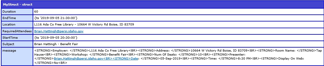 This week however when I pass in a structure like this 6 hours is added to the start and end time of the event. That and the message is displayed as text and is no longer rendered in HTML. Any ideas as to where to look for what changed?