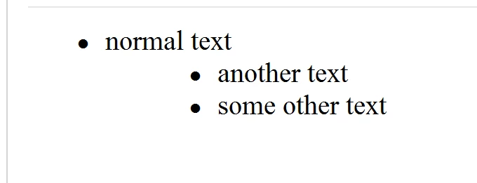 <ul><li>normal text</li><li style="text-indent: 4em">another text</li><li style="text-indent: 4em">some other text</li></ul>