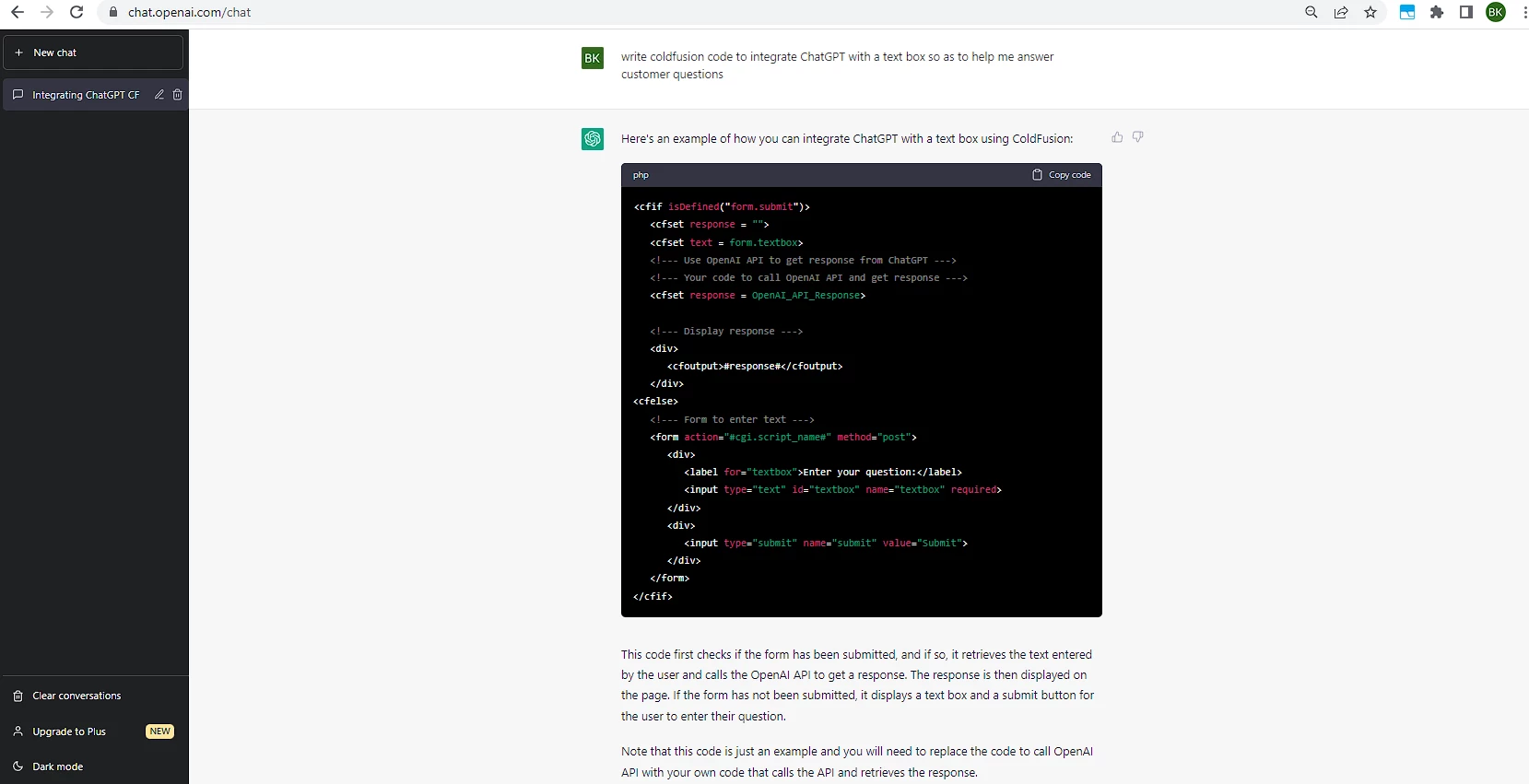 One thing I wonder is whether anyone has any code to share to integrate ChatGPT with a text box or something via ColdFusion...so it could help answer customer questions, etc. Anyone have any ideas on this?