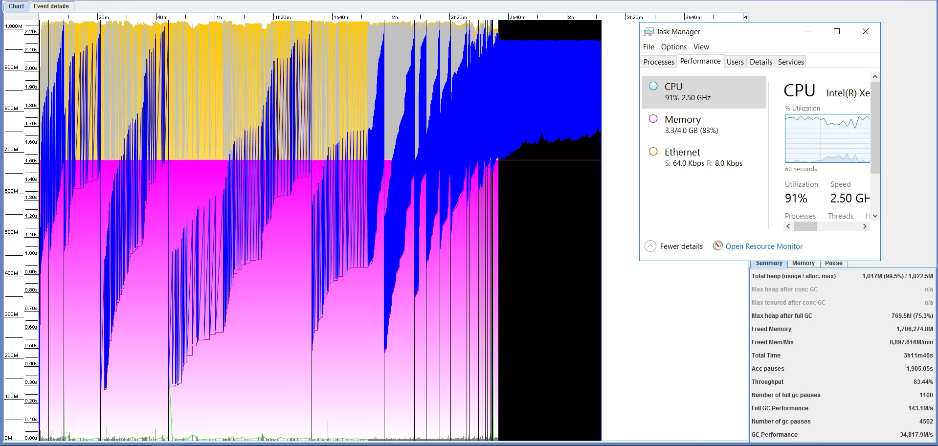 I've also done a few thread dumps and notice the ParOldGen is always maxed out around 99% when the issue occurs. I didn't see anything too obvious in the thread dump otherwise. Could post more if needed.