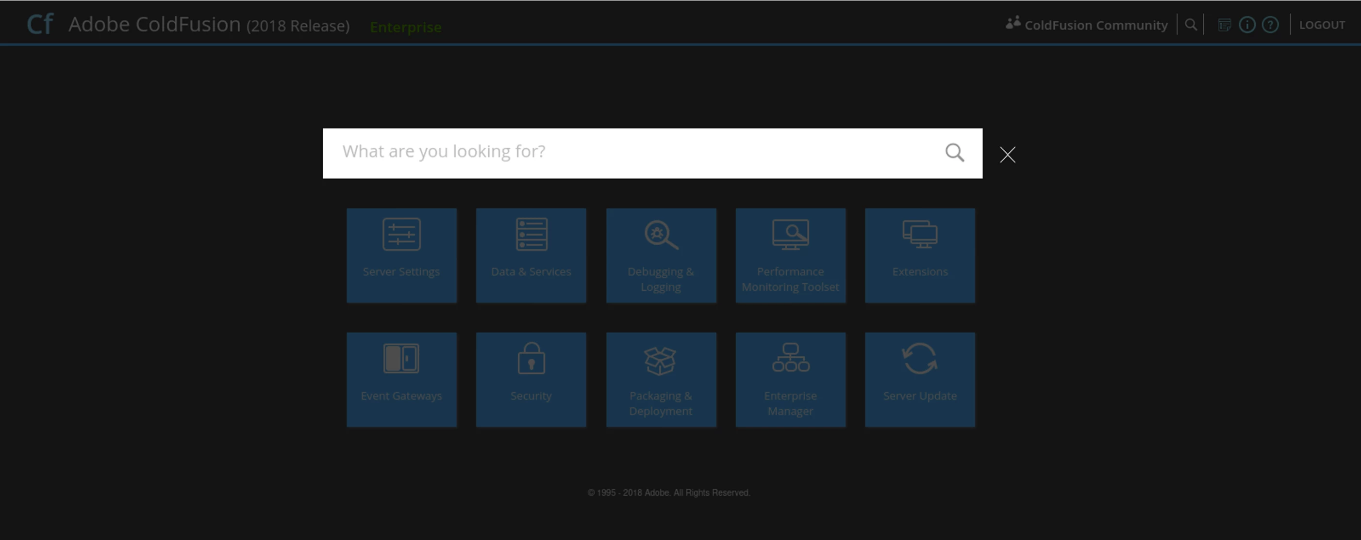 ColdFusion 2018 changing docBase renders administrator page grayed out with a search bar.