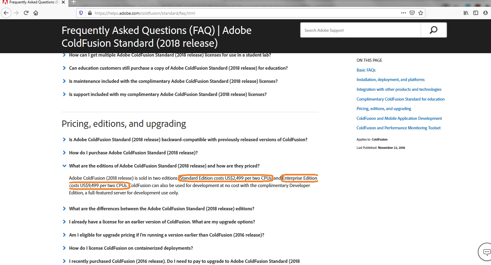 I need to purchase a ColdFusion 2018 license, and I'm on the fence of what edition our company needs. Our company is small, and doesn't want to overpay, but I do not want our web applications to suffer from slow performance. For an environment that has around 300-350 maximum users that login, and 12 active web applications with more being developed, which edition should I go with? What are the specific reasons why I should go with this edition over the other? I'm thinking it would be wiser to go with Enterprise edition based off the companies growth, but I would like specific input as to why this would be the best choice. Any answers will be greatly appreciated.