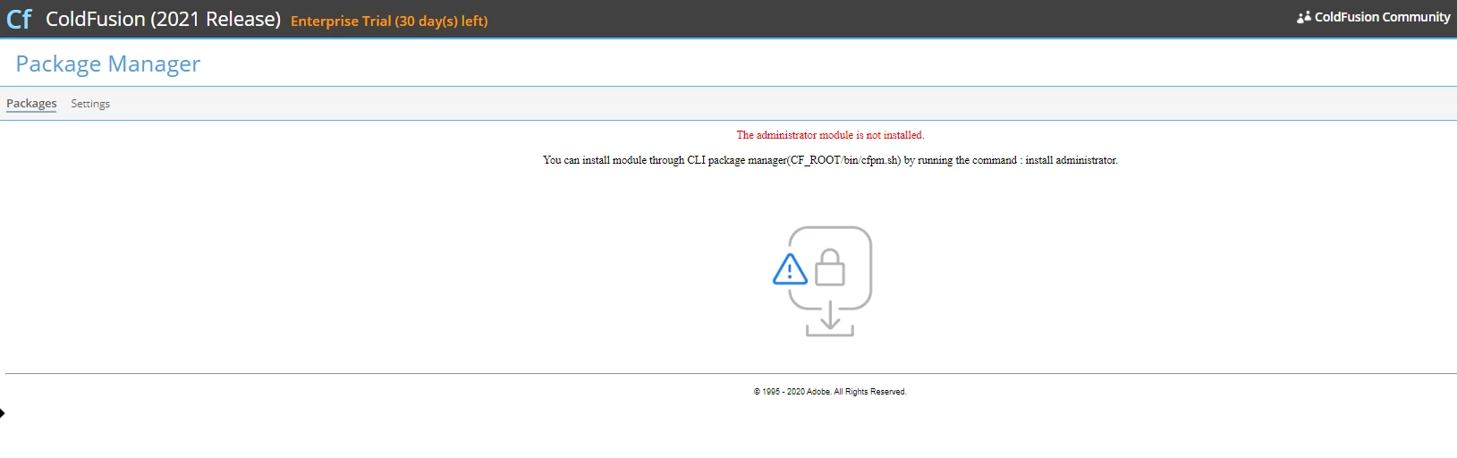You can install module through CLI package manager(CF_ROOT/bin/cfpm.sh) by running the command : install administrator.