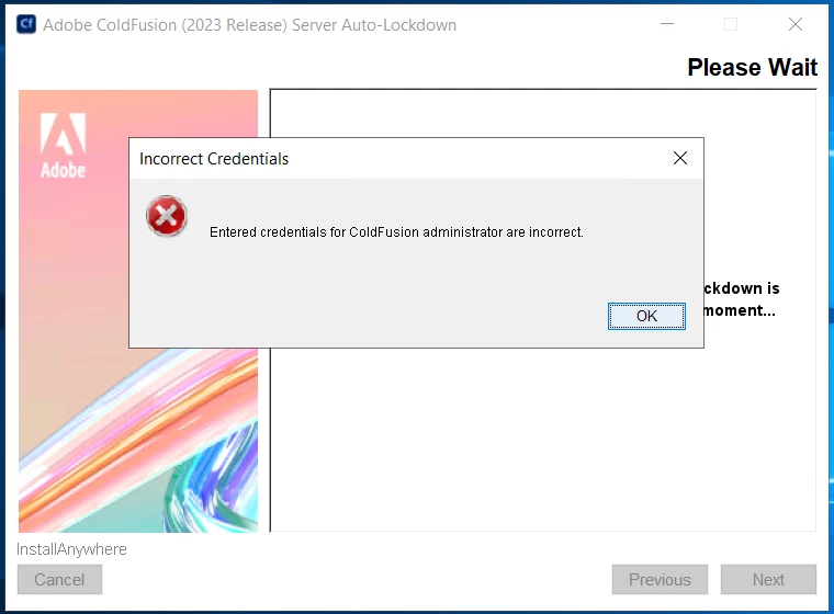 Coldfusion 2023 auto lockdown incorrect administrator credentials error
