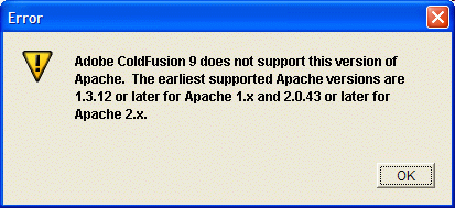 Adobe Coldfusion 9 does not support this version of Apache. The earliest supported Apache versions are 1.2.12 or later for Apache 1.x and 2.0.43 or later for Apache 2.x.