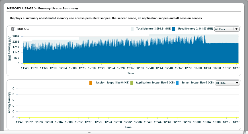 I've already gone through the drill of updating my JDK (to 1.6.20) per Charlie Arehart's suggestion. What I'm seeing is really weird. The process runs along fine for about two hours, which gets it about halfway through the total number of items to be processed, and the speed is on par or better than it is in 32-bit. Then all of a sudden, it screeches to a crawl, taking 4-5 times as long to process each chunk of items. What's weird is that up to that point, I can see the JVM memory usage in CF Server Monitor, and it's spiky but remaining consistently below the 3Gb ceiling. Right at the point that it slowed down, the memory levels off around 2.1Gb and stops spiking (image attached). I would have expected to see it level off at max memory and get slow, but if there's still almost a gig of memory free and nothing else is running on the server, why is it slowing down? I verified there are no issues on the database servers I'm using, and this has happened exactly the same way twice day, once with the original JDK from CF8.0.1 and once with the new one. I checked the JRUN logs, but there's nothing significant in there.