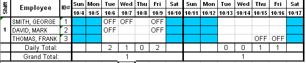 So, to explain, if one person is OFF 2 days in a row, then add 1 to the grand total. If 2 people are OFF 2 days in a row, then you'd add 2 to the total. However, if a person is OFF one day (as in row 2) and not OFF again the following day, then don't add 1 to the total. By the way, this is a schedule for the whole year, and there is a total for each week.