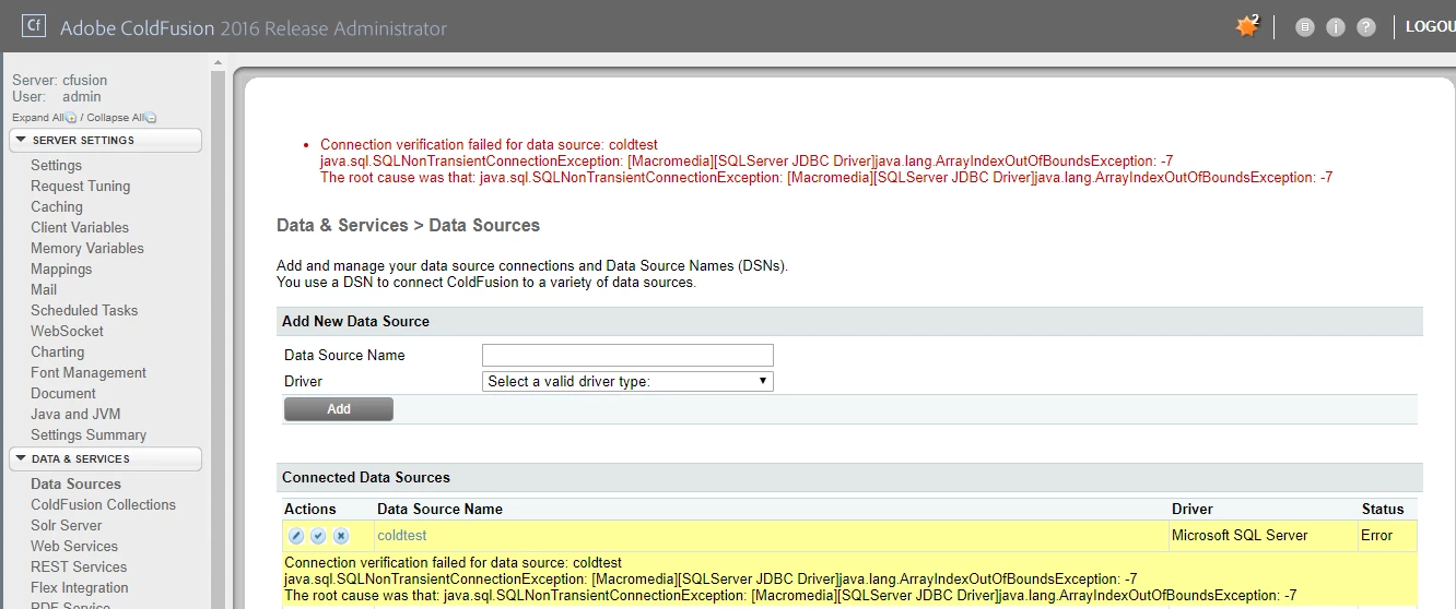 The root cause was that: java.sql.SQLNonTransientConnectionException: [Macromedia][SQLServer JDBC Driver]java.lang.ArrayIndexOutOfBoundsException: -7