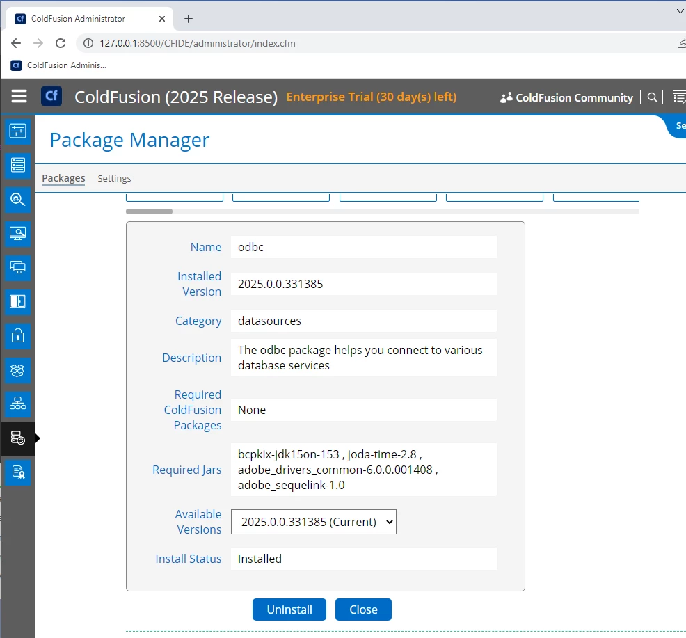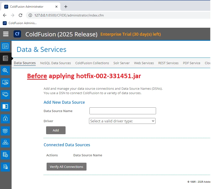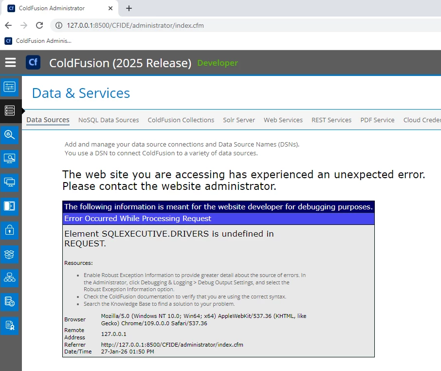 Element SQLEXECUTIVE.DRIVERS is undefined in REQUEST exception in Data Sources tab in Cold Fusion 2025