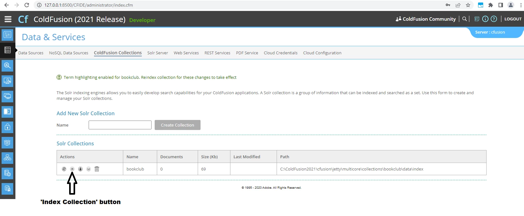 However I don't see a Manage Collection option on that page in Coldfusion Adminstrator (2021)
