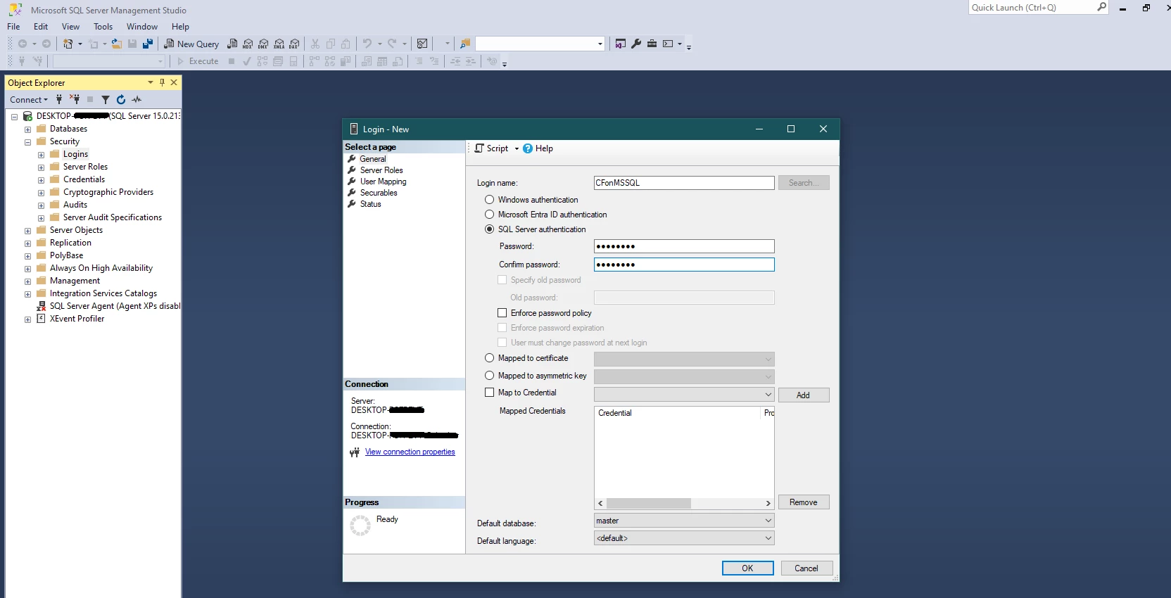 Error Setting up SQL Server datasource in CF Admin: "Cannot open database XXXYYY requested by login"