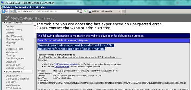 "Error","ajp-bio-8014-exec-1","02/07/18","06:04:44","cfadmin","Element sessionManagement is undefined in a CFML structure referenced as part of an expression. The specific sequence of files included or processed is: D:\ColdFusion11\cfusion\wwwroot\CFIDE\administrator\updates\index.cfm, line: 41