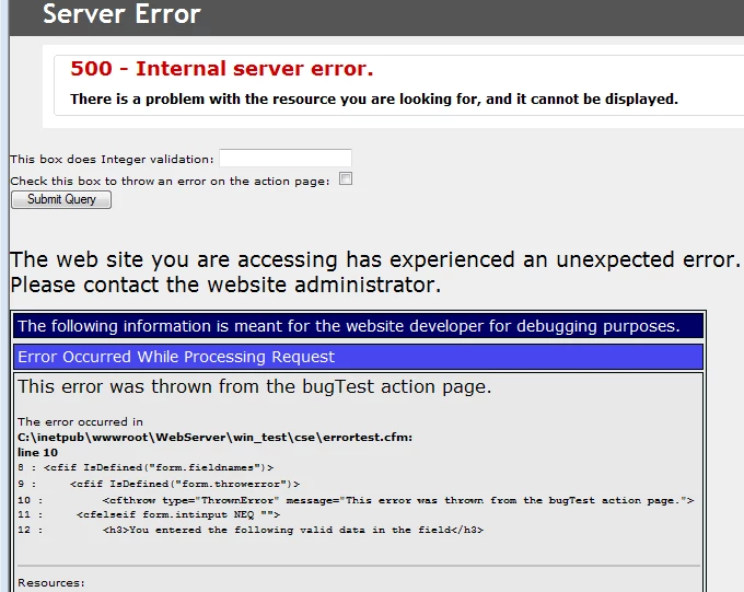 <cfthrow type="ThrownError" message="This error was thrown from the bugTest action page.">