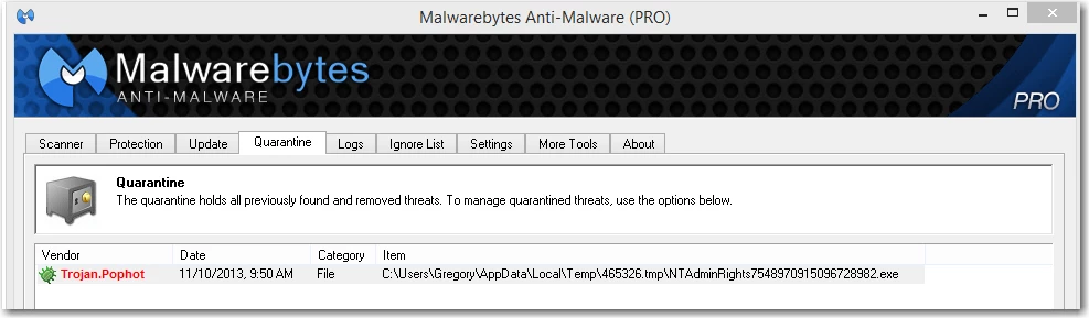 Whenever I start to install the ColdFusion 10 installer platform for Windows 8, Malwarebytes quarantines a file it labels as having the Trojan.pophot virus. The suspect file is NTAdminRights..., where "..." is a random number ending with .exe.