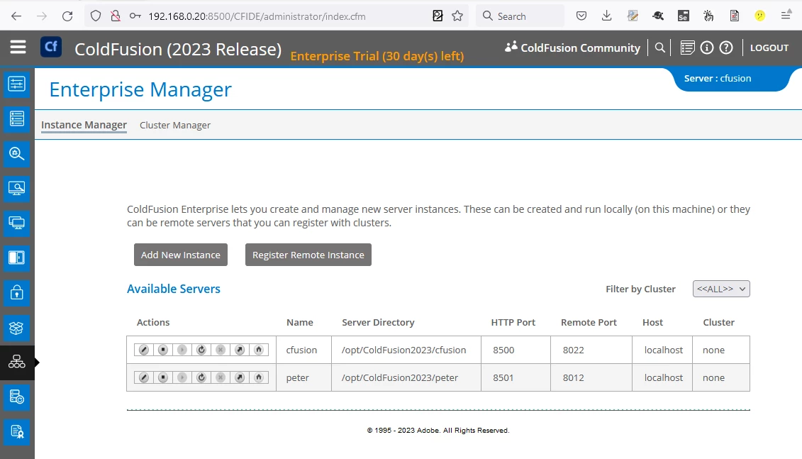 We are migrating from Coldfusion 2018 to Coldfusion 2023. We run Enterprise Edition and have multiple instances. For secuity reasons we remove the HTTP listers after creating the instace by removing the connector from <server-dir>/runtime/conf/server.xml
