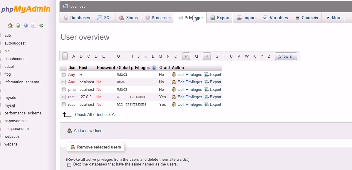 access the "Privilages" operation because it doesn't exist as an option along the top. Hence, I can't find out how to access my "User overview" User, Host, Password,