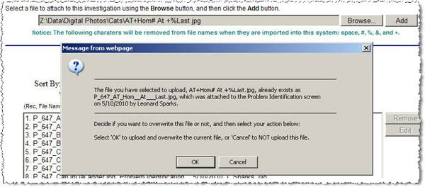 The logical solution would be to be able to test the new final file name (the name after making the substitutions mentioned above) against the existing files in the database before you went from the page where the <input type=file> control to the associated _action.cfm page where the <cffile> object is located. Given that this seems to be the province of Ajax, this would seem like a natural use of the really interesting technology. I have can determine the file name from the onChange action on the <input type=File> so that this would be the place for Ajax to come to the rescue by looking up the final file name and then letting the user know whether the resultant name is a unique within the database or not. If so, I'll just enable the Add button which sets right next to the <input > control and let them upload it. If not, I'll put up an error message telling them that this file already exists in the system.