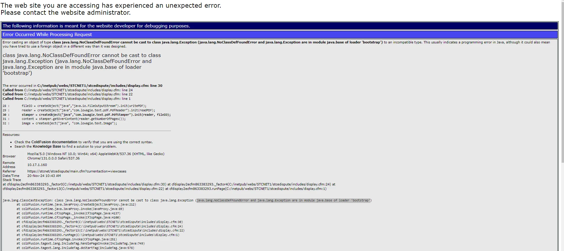 This runs fine in our dev environment, which is identical to our production. I get this error on production. Both servers are running Coldfusion 2023 update 11. Same Java version 17.0.6, etc. I'm at a loss as to why it would work on one but not the other. I'm not sure what I should be looking for.