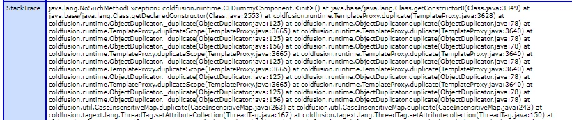 I'm working with an application running on ColdFusion 2018 and Java 11. It uses threads to make multiple http requests at once to reduce the wait time of loading data. About once a month, sometimes more, we start to get error reports of java.lang.NoSuchMethodException: coldfusion.runtime.CFDummyComponent.<init>() on the line of code that creates a thread. I haven't found any pattern to it and the error seems to just keep happening for every request that goes through the affected code path after it's first triggered until the server is restarted. This is occurring in production but I haven't been able to reproduce it locally so I have a feeling it's related to the number of users of the system. Can anyone offer a suggestion on what could be the cause? Please see the related code and error dump snippets below.
