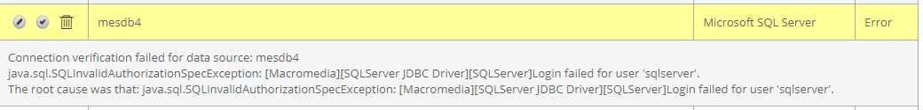 java.sql.SQLInvalidAuthorizationSpecException: [Macromedia][SQLServer JDBC Driver][SQLServer]Login failed for user 'sqlserver'.