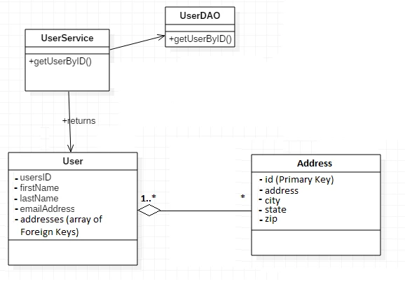 In the above example the client would request getUserByID() from the UserService object which would return a bean object containing the data from the userDAO object and the AddressGateway object. Is this the correct way to go about this type of data retrieval?