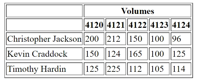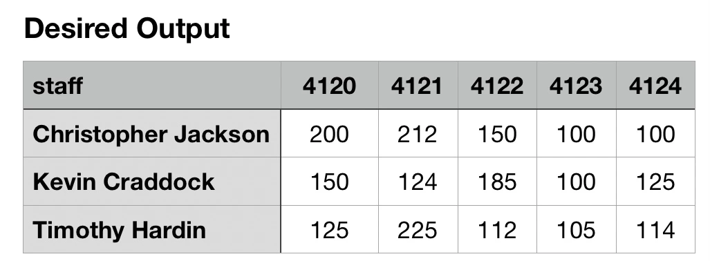 I’m trying to output data in the form of a grid pattern using coldfusion or MySQL . When I execute the code below, it outputs it in the regular drill down format. I Want to see if there’s a ColdFusion method and or a MySQL method that will allow my data to be out in a grid-like format With each row having a different person and each column having the results for that particular person in the row over a period of time. Please see the attached code and please also see the attached desired output. I am trying to see how I can get the desired results to look like the second image. Is it an array function in ColdFusion that I would need to do that in?