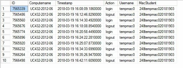 We have a system which records login and logouts for computers on our campus. I need to work out how long each computer has been used for and we can't change what the program logs as it is a third party tool used for managing the network.