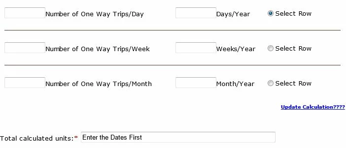 In the tab format, when the Update Calculation link is selected, the page would take the values entered in the Number of One Way Trip/Day and Day/Year and calculate the value for the Total calculated units box. (Per the image)