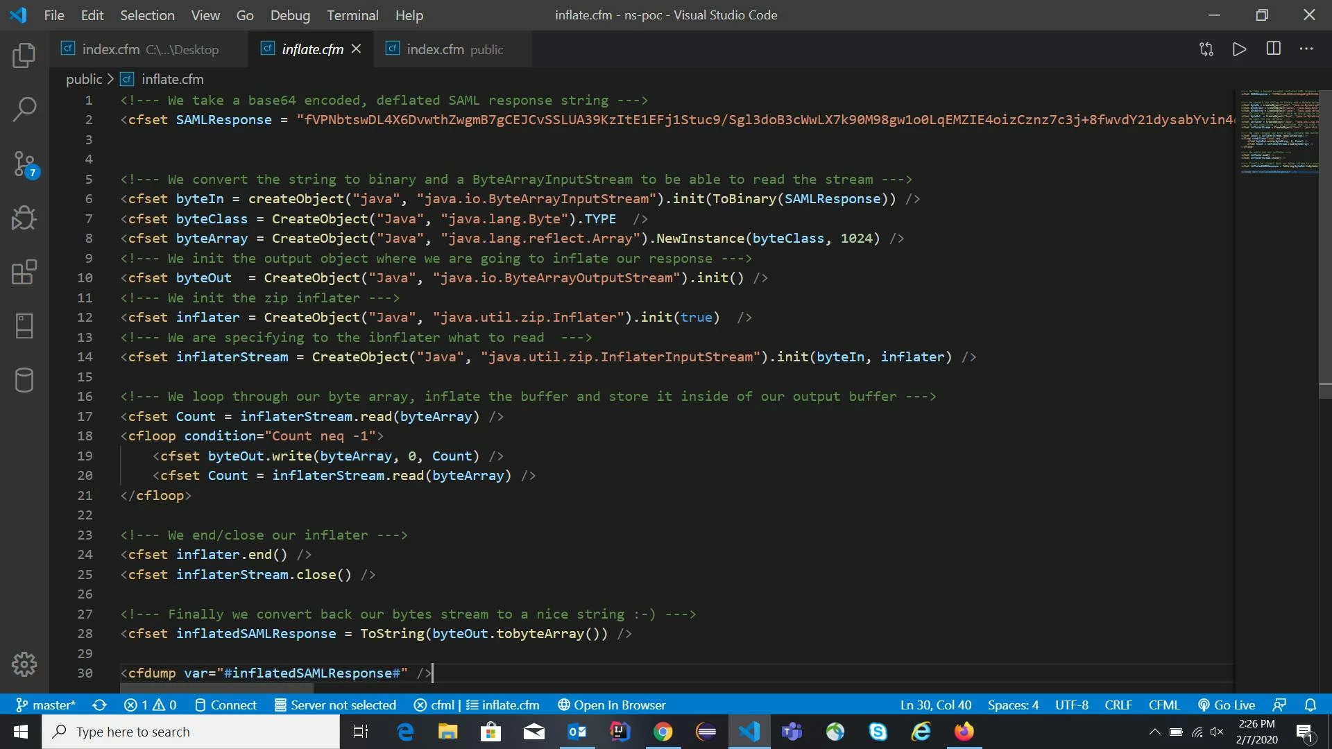 <cfset inflatedSAMLResponse = ToString(byteOut.tobyteArray()) />