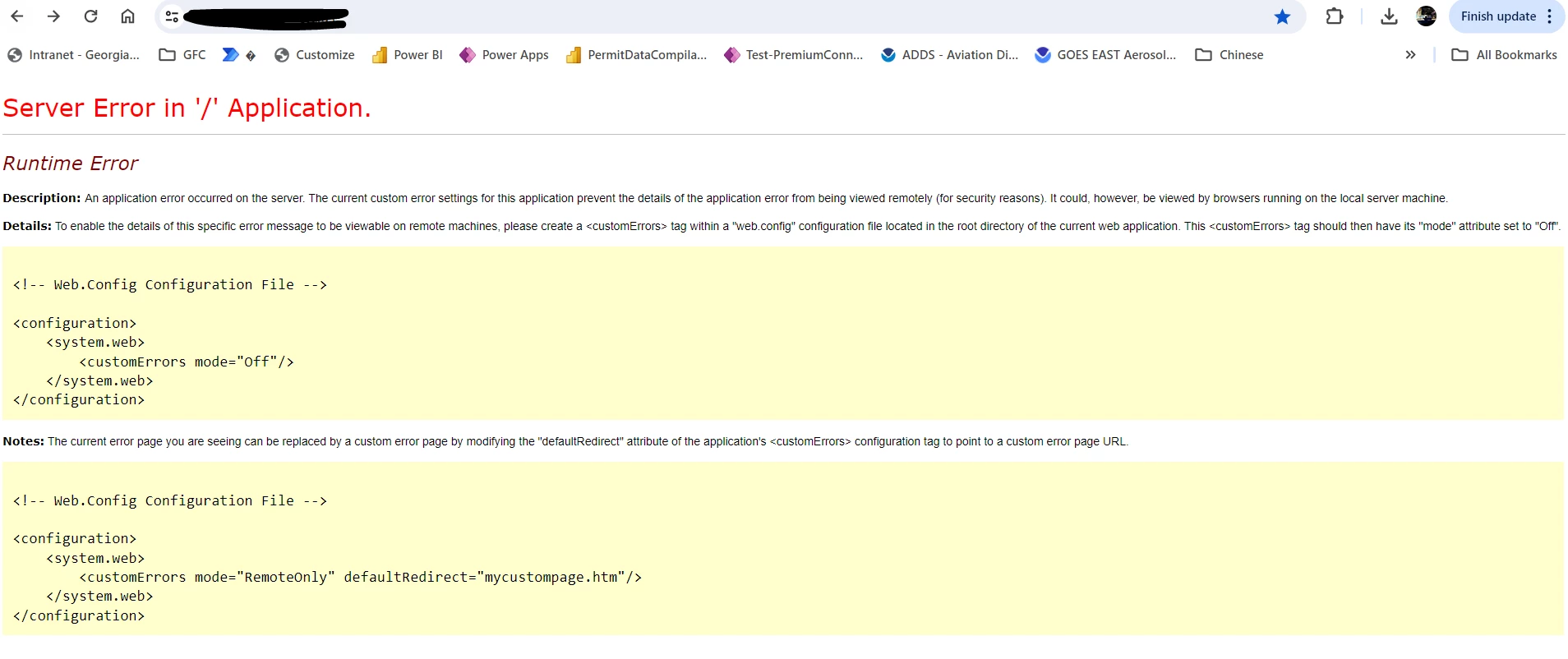 Or you could instead use the iis ui. At this web site level, find the "error pages" feature, open that, then use the "edit feature settings" on the right, and change the value to "detailed". (Google for more details if needed.) Now refresh the page.