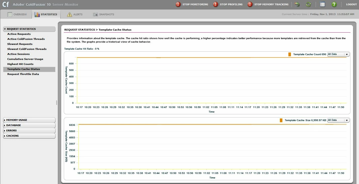 CF10/Win2008R2/IIS7.5. Server monitor always shows my "Template cache hit ratio" is 0%. Why? I have all profiling enabled. My template cache count is up to around 700, with a max set of 2000. Surely some of my cached templates are being hit more than once?