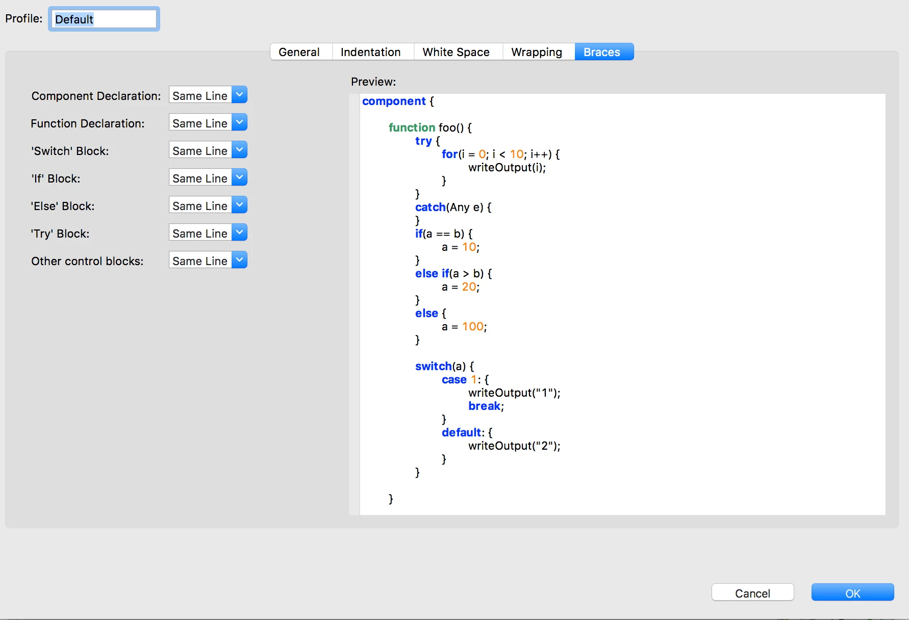 I am trying to change the braces in ColdFusion Builder to be on the same line, but it is not working for me.