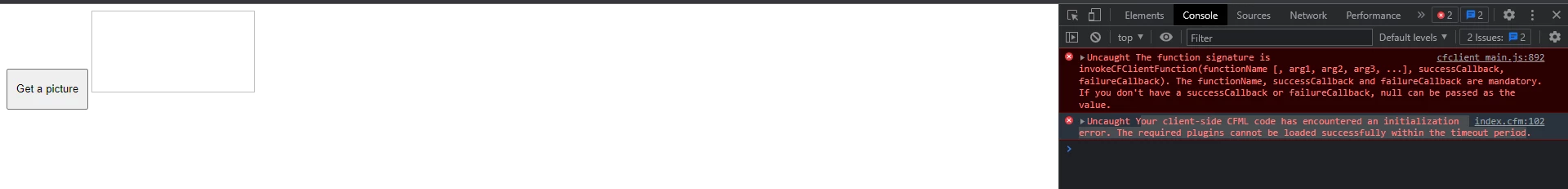 Your client-side CFML code has encountered an initialization error. The required plugins cannot be loaded successfully within the timeout period.