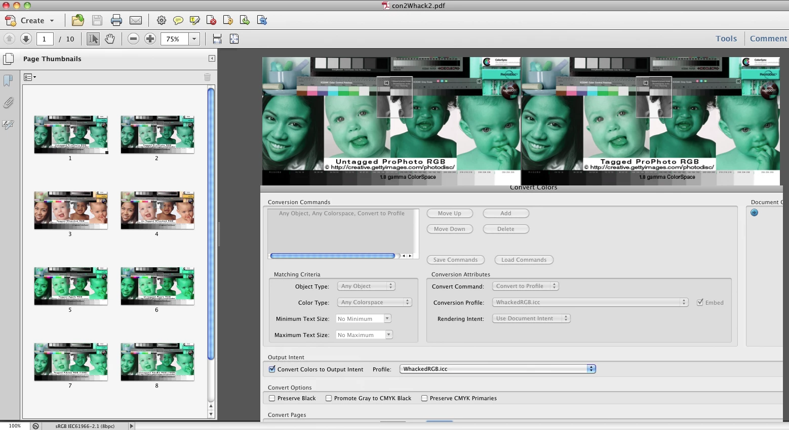 here is the Exported PDF in Acrobat WITH CONVERTED COLORS to ProPhoto RGB destination profile embedded: