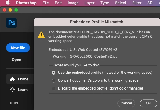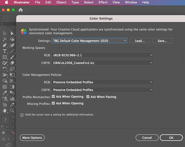 Illustrator v26.0.3 Does not detect the embedded profiles of images placed. I have my CMYK working space set to GRACoL2006_Coated1v2, and the plicies are all set to preserve embedded profiles and to ask when there is a mismatch.
