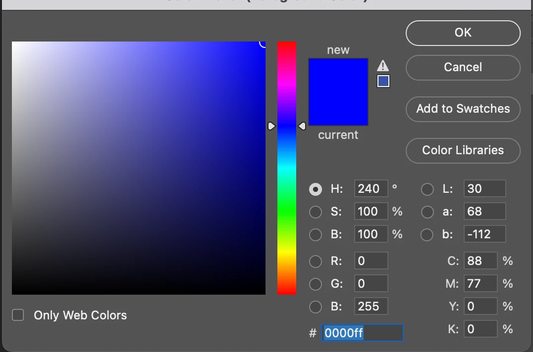 The rgb color is #0000ff. I looked around and could not find a comparable color in the cmyk palette. I tried some of the on line rbg-to-cmyk converters but to no avail.