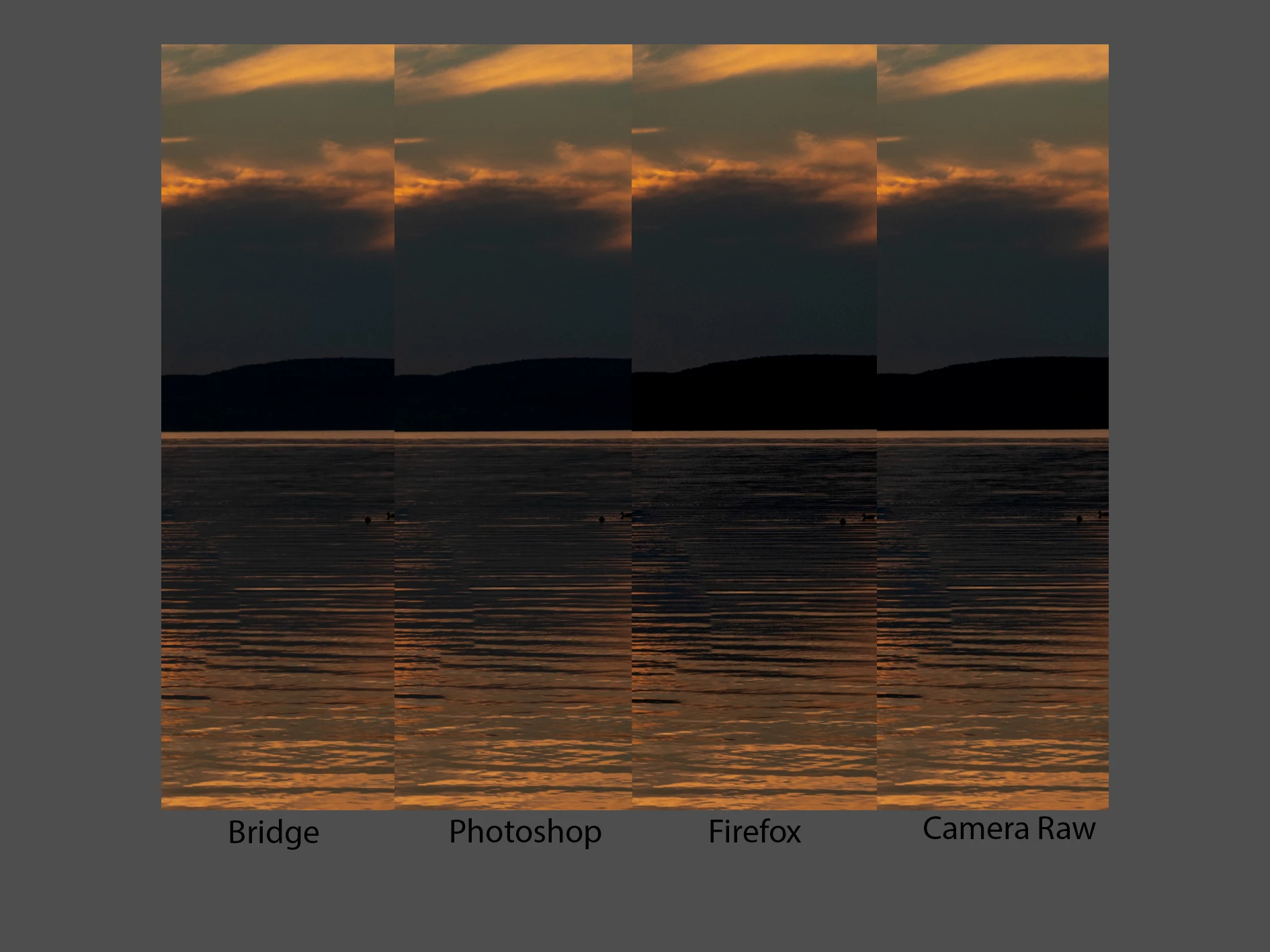 LUT profiles is another risky proposition. Here I've seen some issues in Photoshop, mostly color banding in ProPhoto. That's symptomatic, because ProPhoto is so huge that the smallest inaccuracies, masked in smaller color spaces, get massively amplified. Though it has to be said that I did this testing a while ago, when Photoshop GPU code used the OpenGL APIs. It no longer does that, instead the OS-native APIs (Metal and DirectX) are used.