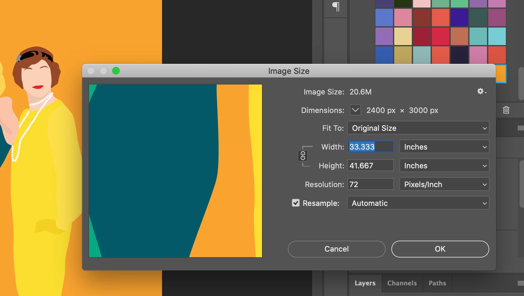 After I saved it I open the document again. I check the ppi which is now at 72ppi and the inches have changed to 33 x 41 inches but the pixels remain the same!! wtf?