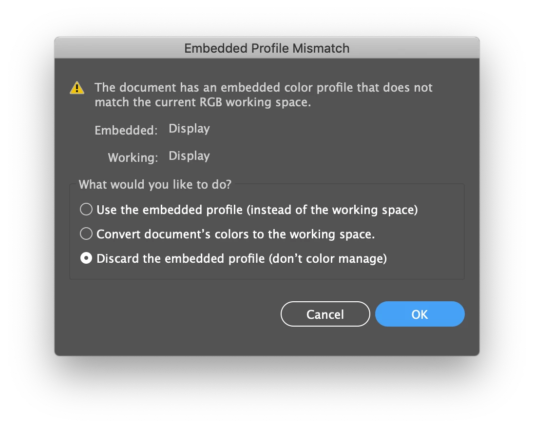 How to handle Profile Mismatch (Color management) in Illustrator?