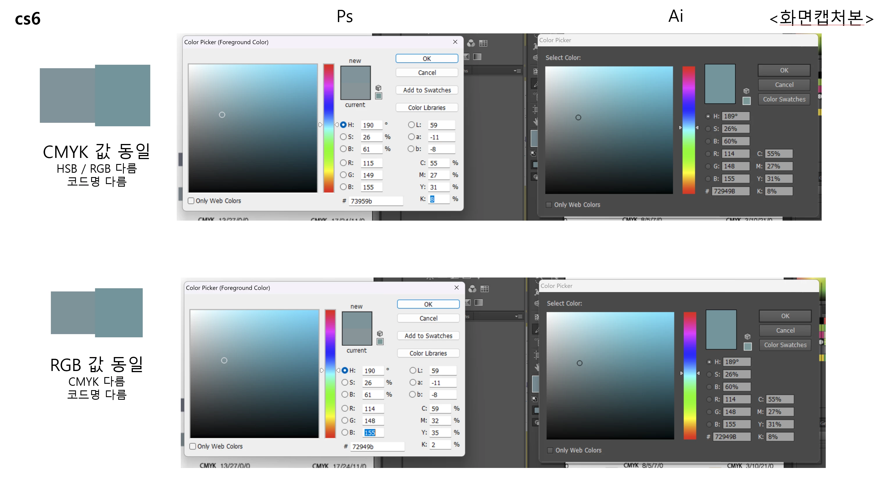 I entered the same color code number in illustration and Photoshop, but does HSB have different values? RGB and CMYK have the same value, but HSB is different. Fragmentally, if you enter #80949b into Photoshop, RGB and CMYK are the same values, but HSB is different from 196/17/61 (Photoshop) and 194/17/60 (illustration). Also, if you enter the color code above in the cs6 version, the three values of RGB, CMYK, and HSB are all different. It makes a difference visually, like a completely different color. Can you tell me why? I knew that each program has a different color, but why is there a numerical difference even though it's the same code number?