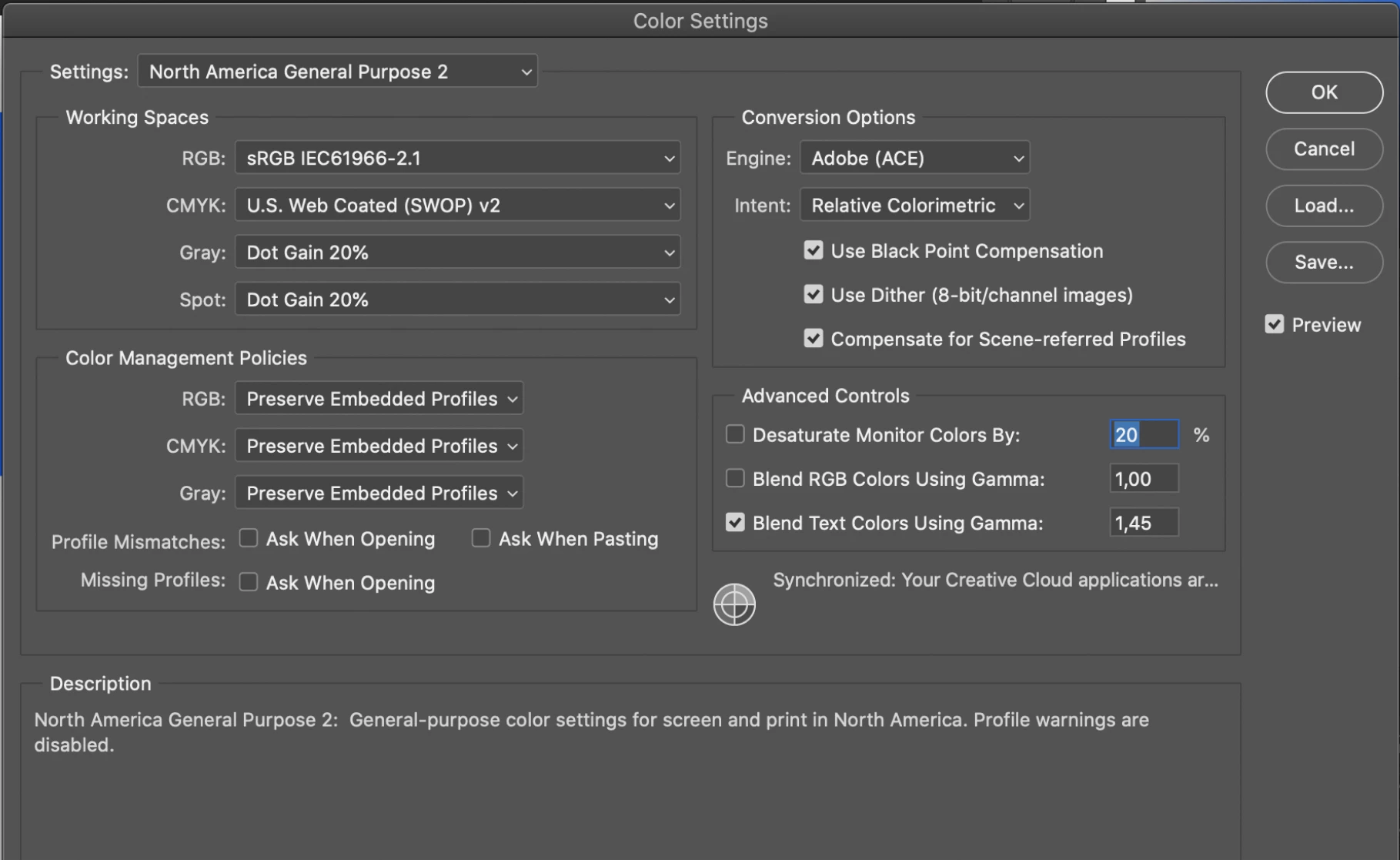 I have noticed that recently something bad happened with my color settings in Photoshop 2020 (and Illustrator). All of the colors there are washed out and there is no difference when I swap colors from RGB to CMYK (cmd+y). Both modes look the same. I have made a few other tests and colors in other software like After Effects, Figma, or Affinity Designer looks fine. Can anyone have the same issue? I already have tried to reinstall PS and erase the settings but it didn't help. Here you got my settings: