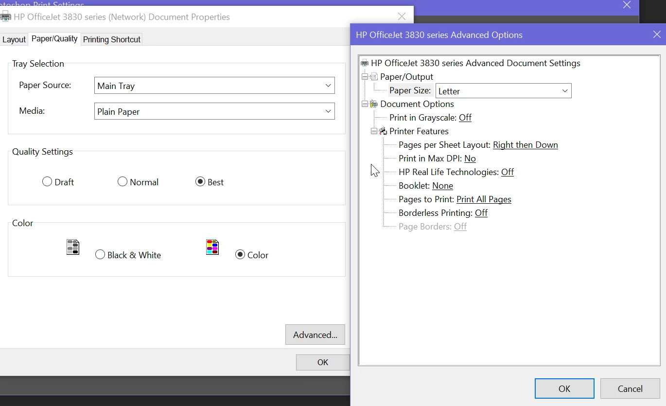 As you can see from the collection of screen grabs I get the warning to make sure the printer settings have been turned off/defaulted to allow PS to manage. When I check I don't see anything that may allow this. My assumption would be that the setting would be in the Advanced Settings, but I don't see any. In checking the HP site, I didn't find much. I did read some of the posts by @D Fosse about the print profile, so Im guessing my issue nayt be the same- however I dont seem to have a print profikle that matches the suggested resolution. Any thoughts would be of great help. Thanks!