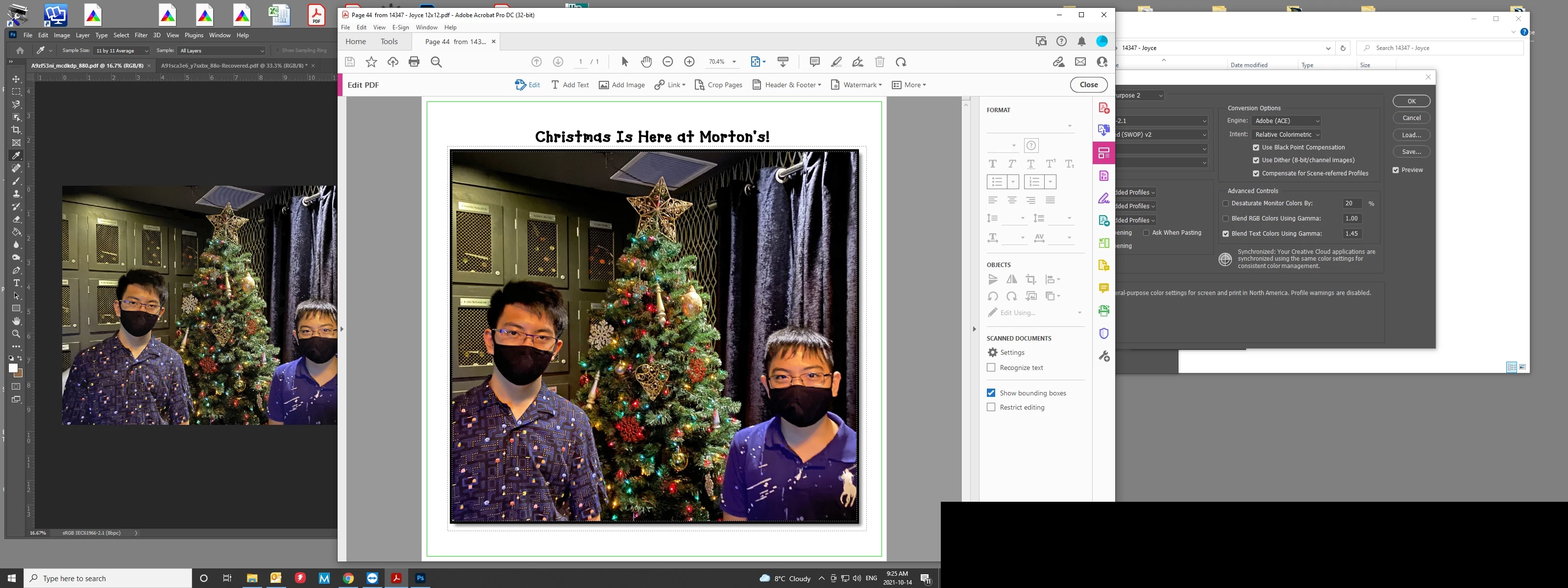 I do not know why I am getting two different results when viewing an image on photoshop versin 22.5.1 and Acrobat Pro 2021.007.20099. I have screened captures the result and you can see that the Acrobat is much more saturated than Photoshop on the same monitor.